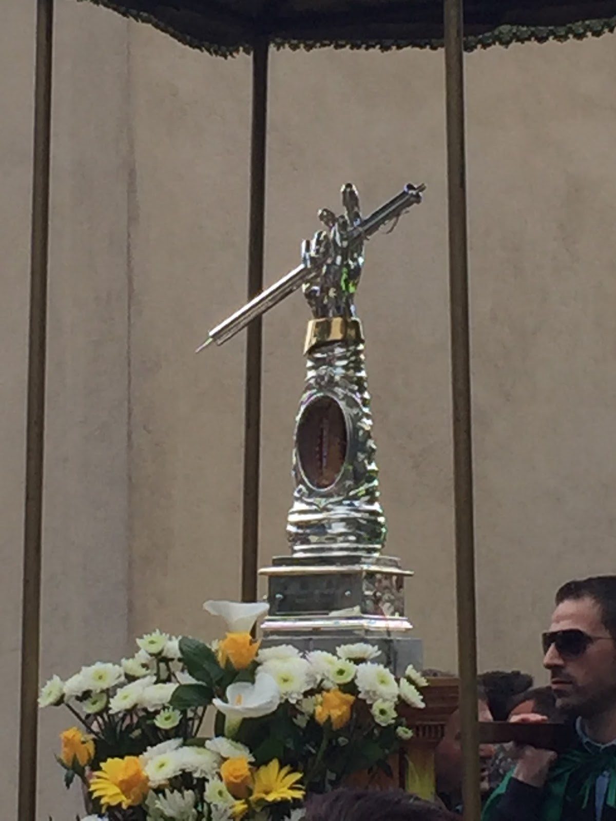 Abbiamo trovato una ottima accoglienza a Caccuri, fin dall'abbondante buffet di dolci che le famiglie avevano preparato per i partecipanti. Il responsabile dell'Associazione, il procuratore fratel Costantino De Bellis, ci ha accolti con grande gioia e ci ha invitati a partecipare alla processione del pomeriggio, durante la quale è stata portata a spalla la reliquia insigne del Santo, una parte di osso del braccio.